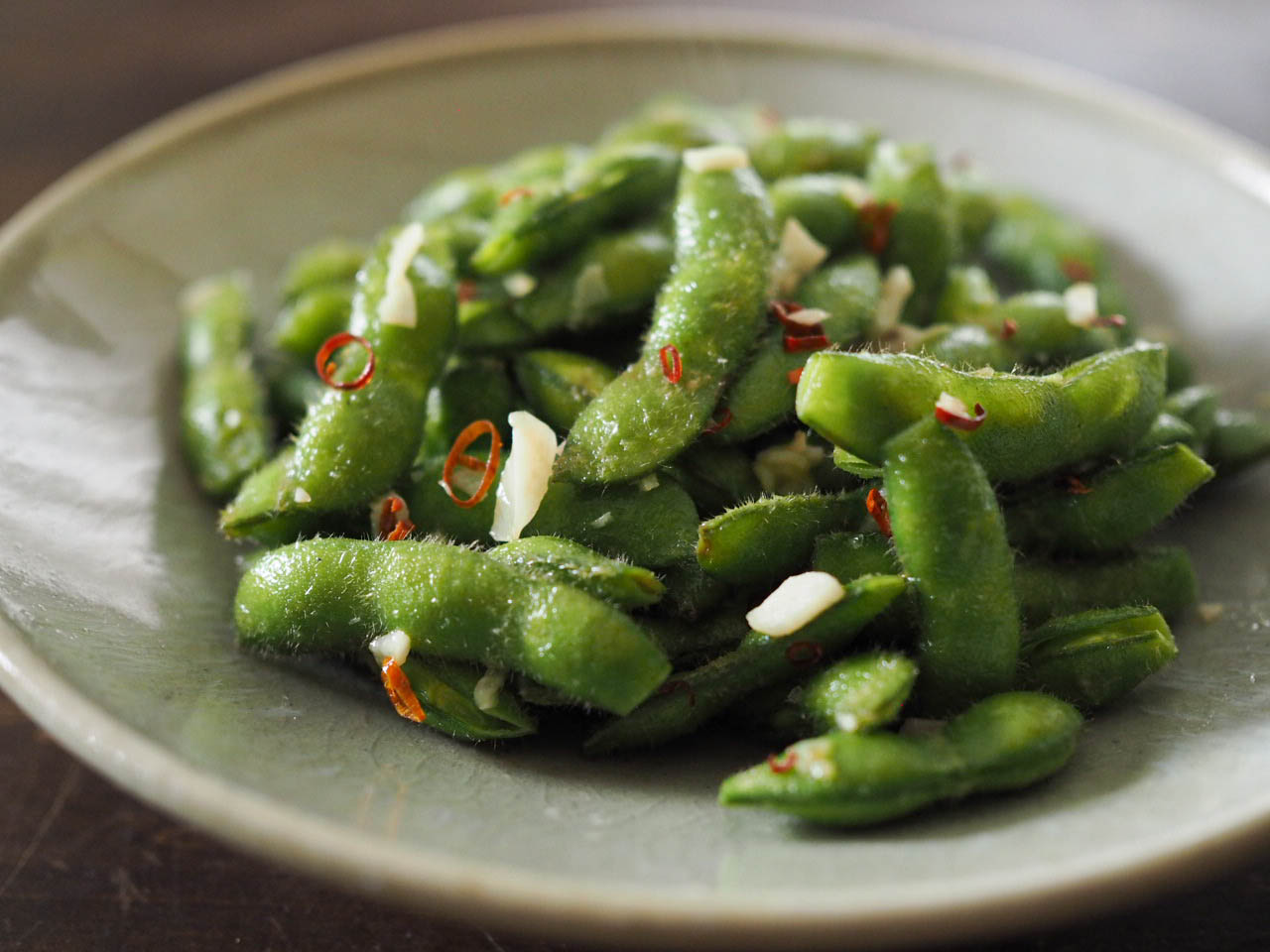 枝豆をゆでるのではなく、ニンニクとオリーブオイルで蒸し焼きにするのがポイントです