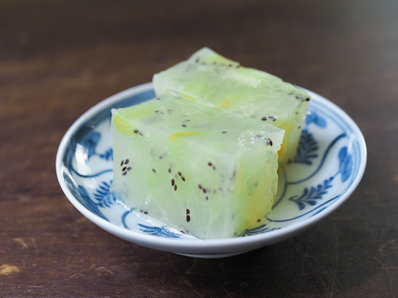 キウイの入っていない寒天と、キウイが密集している部分ができますが