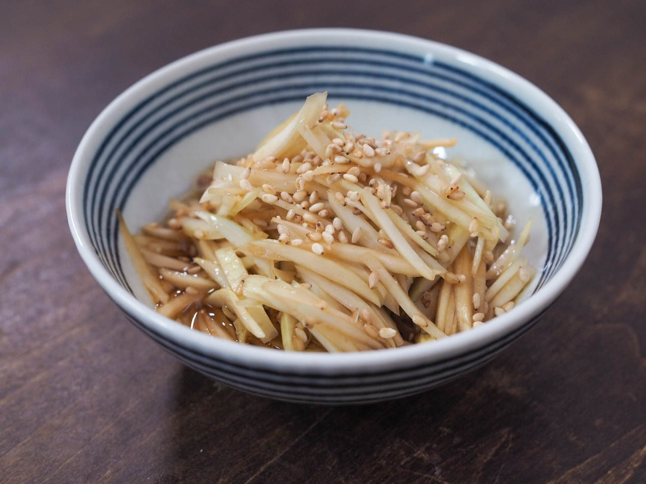 • 大根の皮を細切りにし、しょうゆ、ごま油を混ぜる。