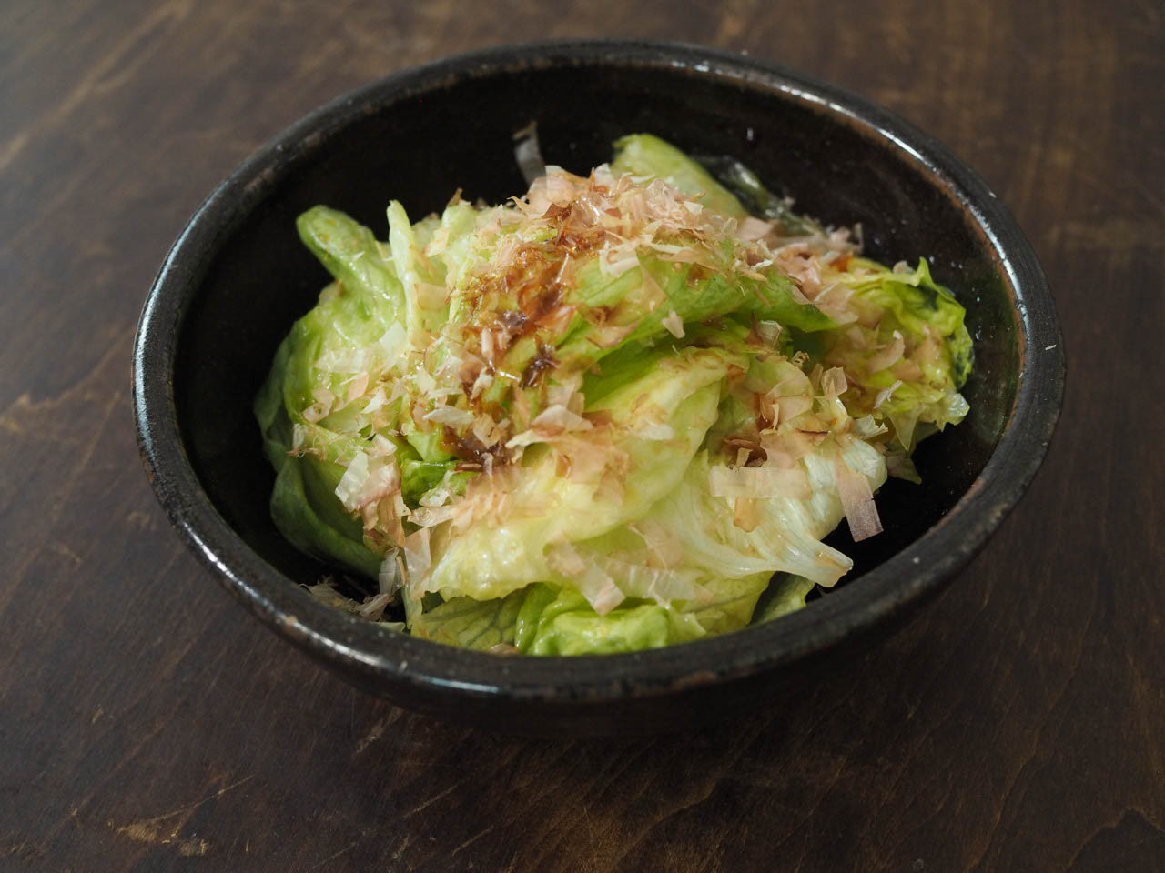 • 器に出し、鰹節をかけ、お好みでさらに醤油をかける。