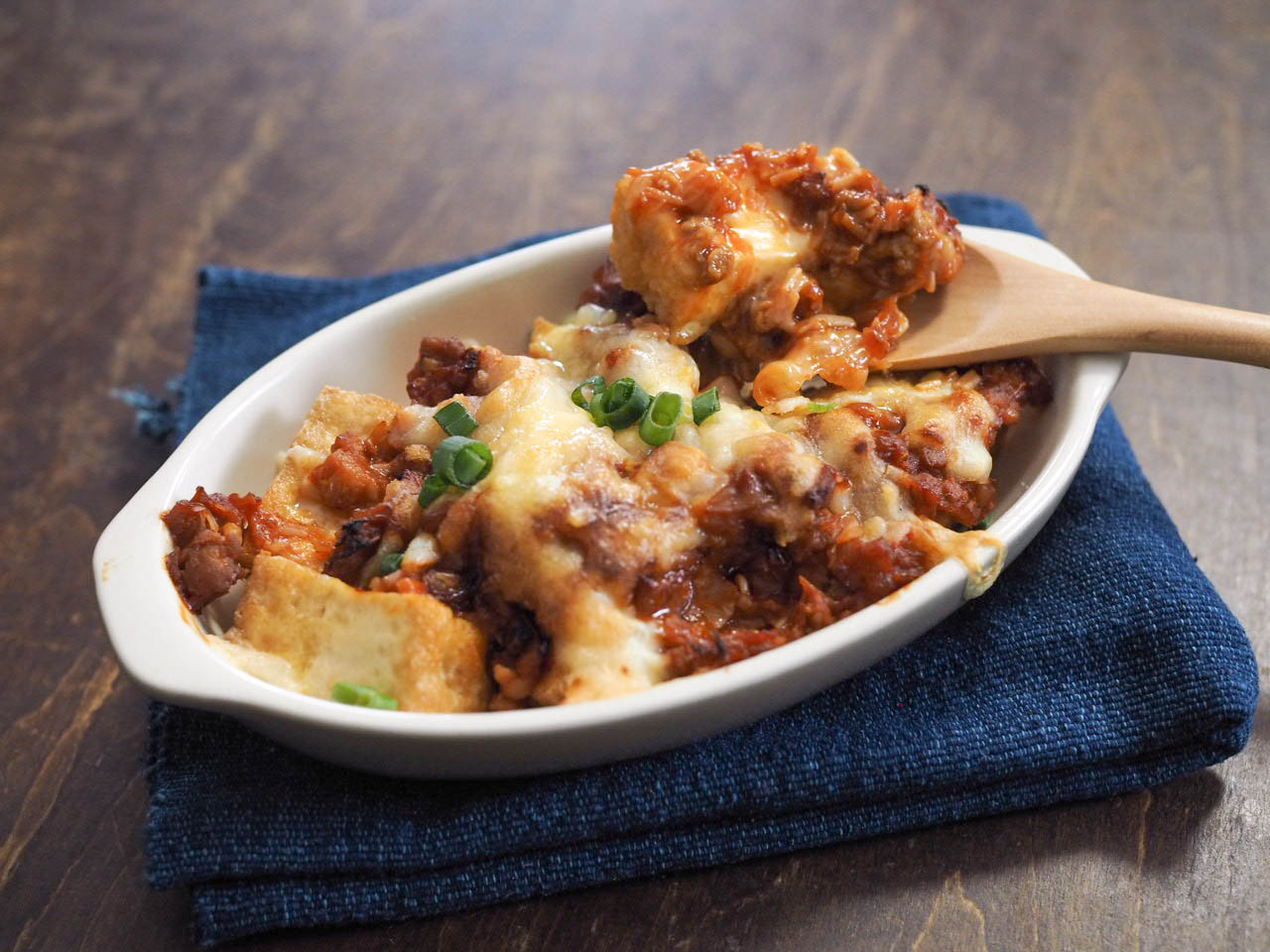 • 厚揚げを食べやすく切って耐熱容器に広げ、ピザ用チーズをのせてからミートソースをかけ、更にチーズをかけてオーブントースター(または魚焼きグリル)で焼く。