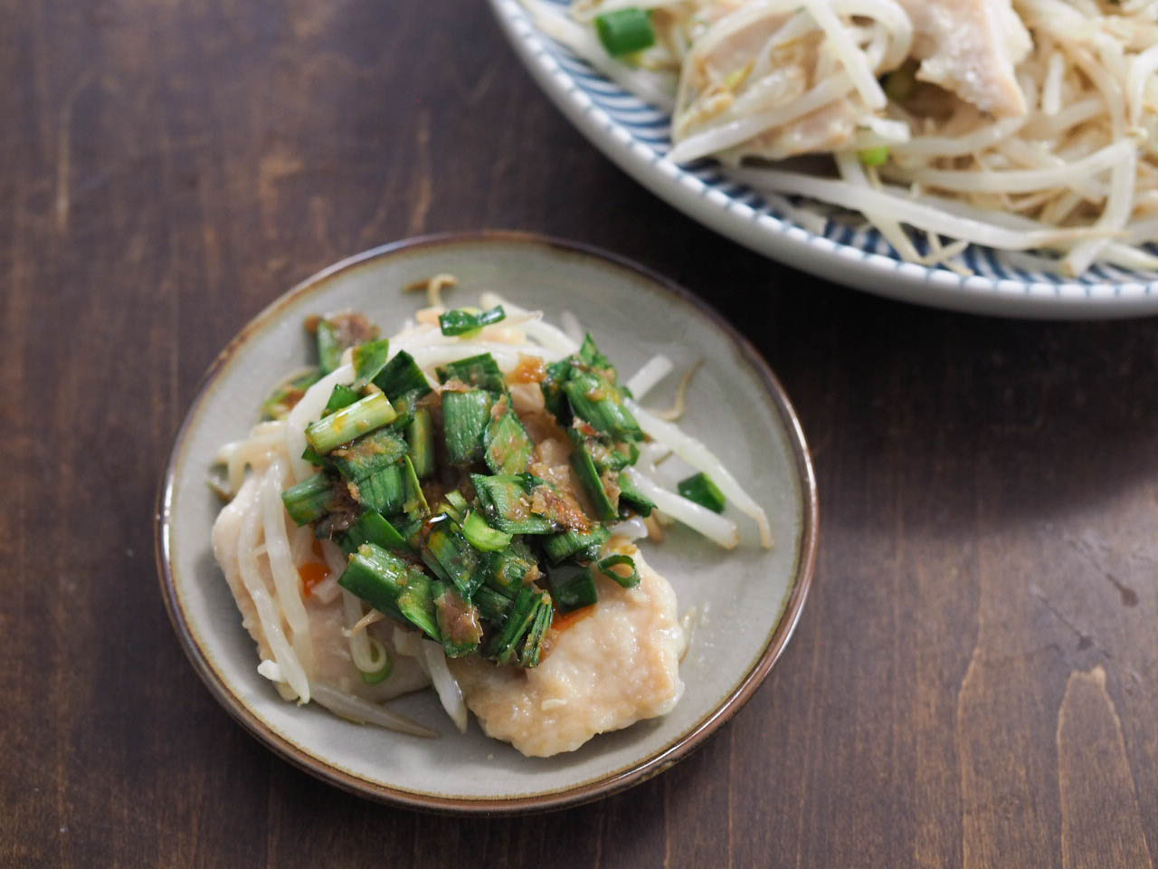 万能鶏むね肉ともやしのシャキシャキ炒め・万能ニラ醤油かけ