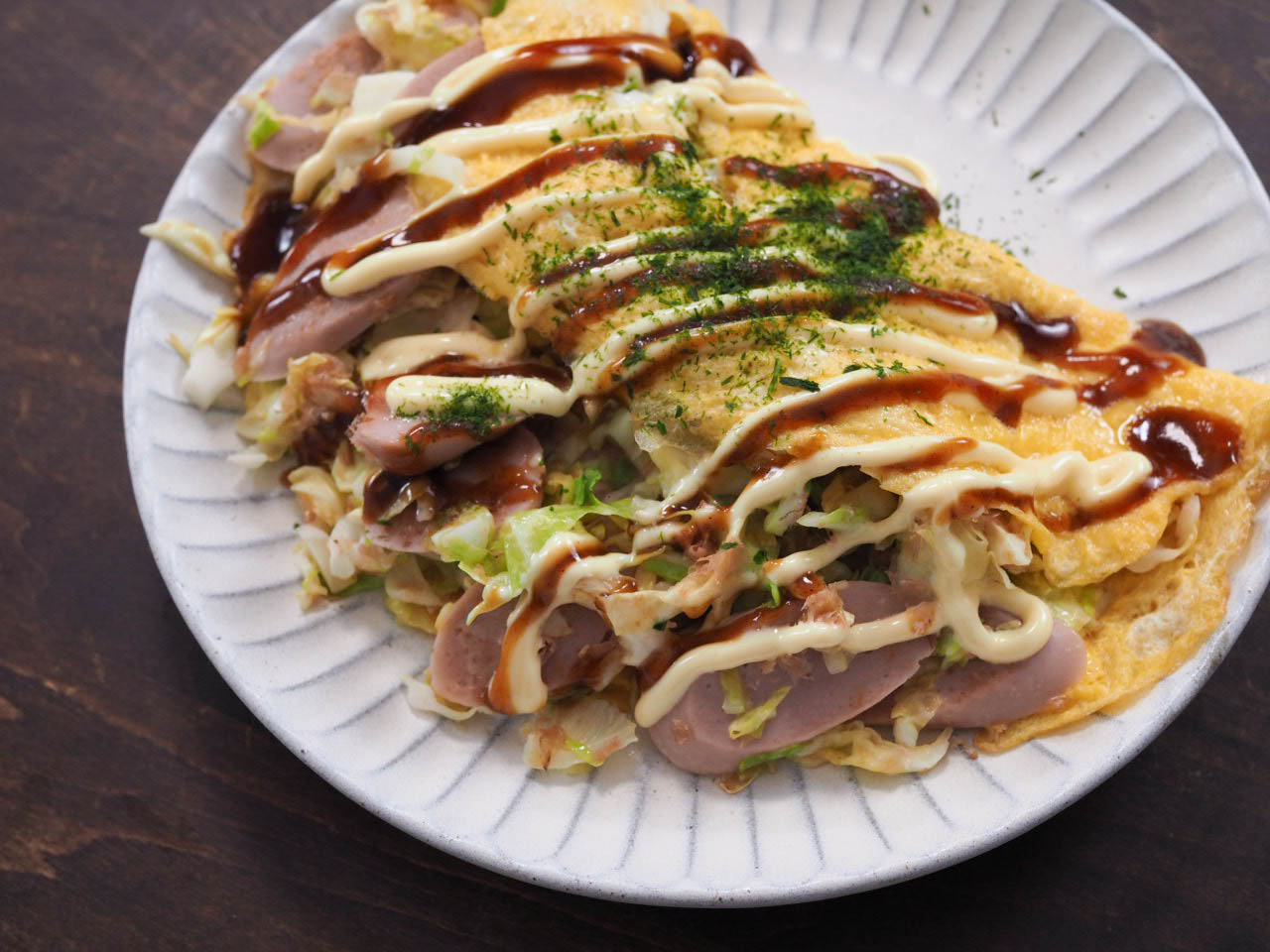お皿に取り出し、お好み焼きソースとマヨネーズをかけ、青のりをかける。