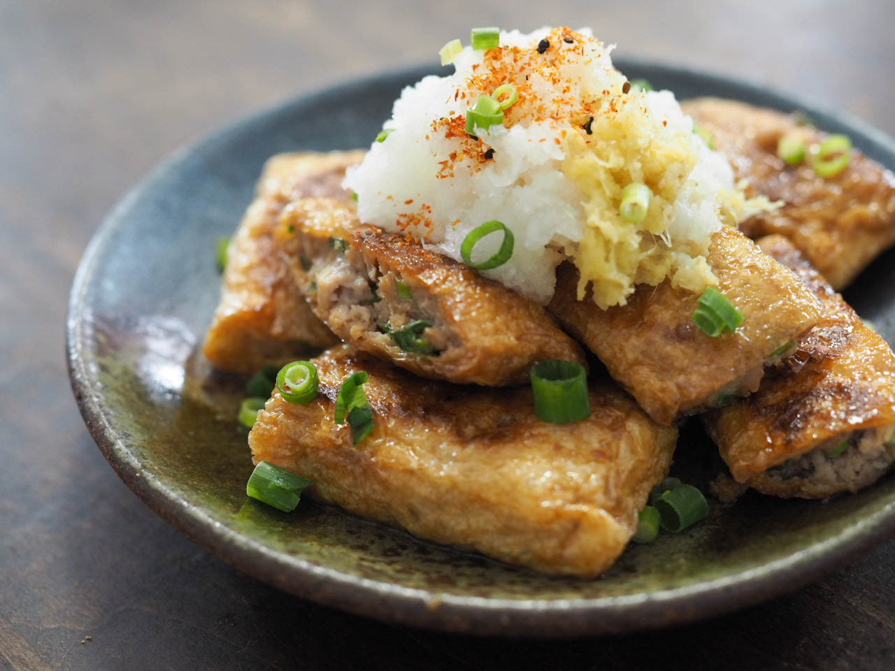 1の油揚げに2のひき肉を入れて、二つに切る。