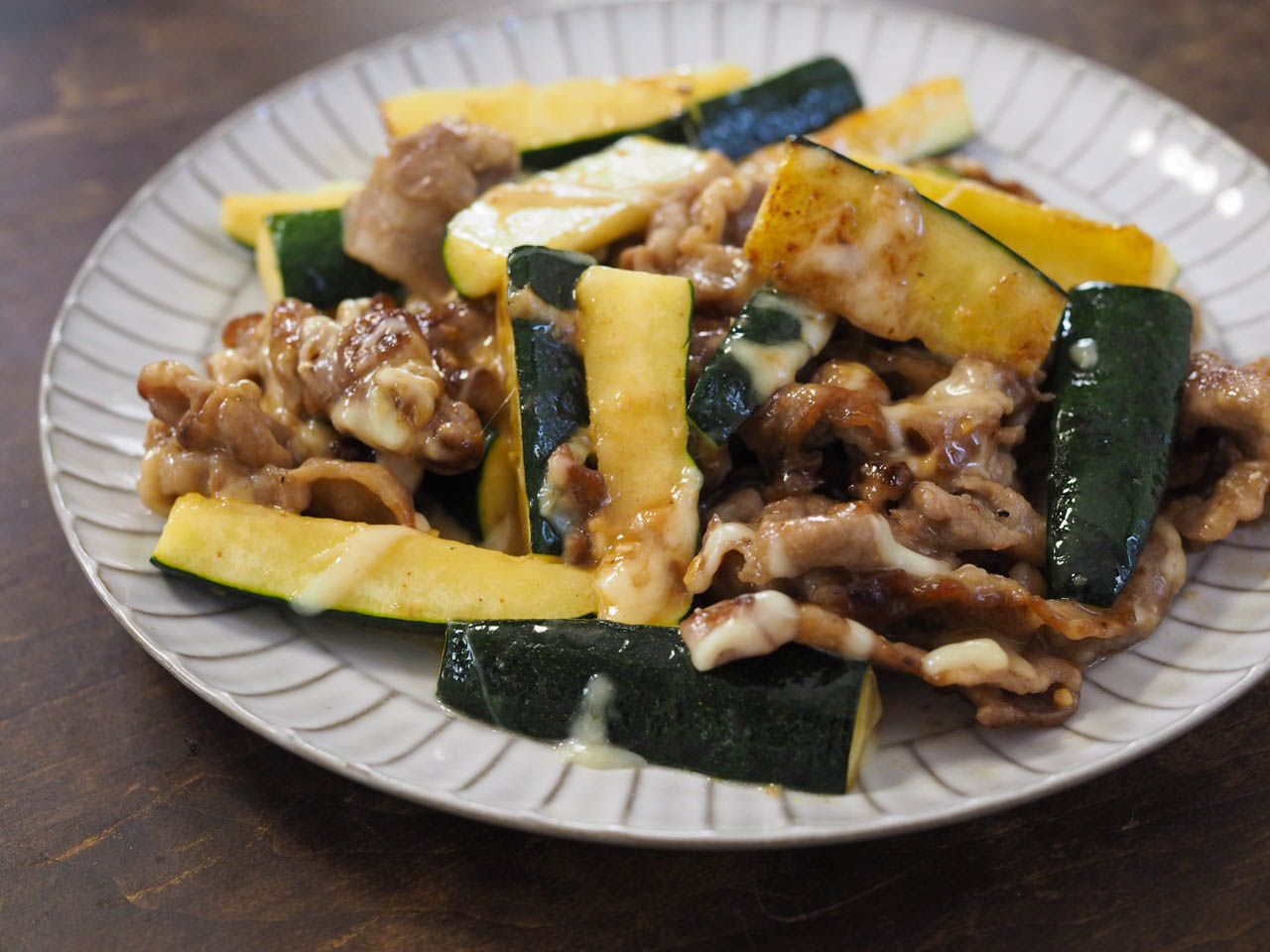 • 豚肉に火が通り、いい焼き色がついたらズッキーニを入れて炒め合わせ、水少々を入れてふたをして蒸し焼きにする。(1~2分)