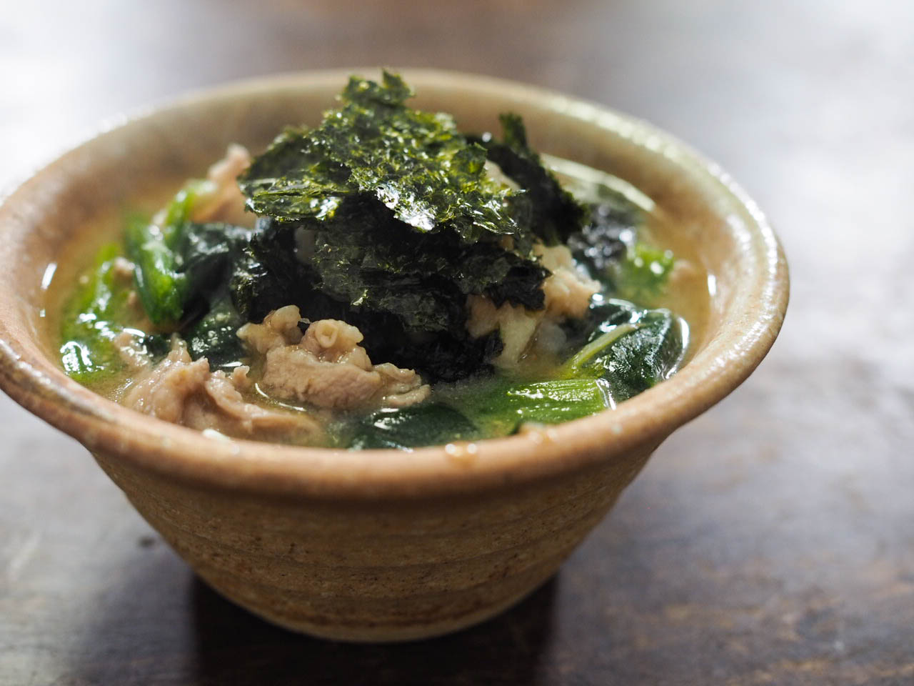フライパンを熱してごま油を入れ、ほうれん草を炒める。Bを入れて沸騰したら1の豚肉をばらばらにしながら入れ、軽く混ぜてふたをして煮る(3~5分)