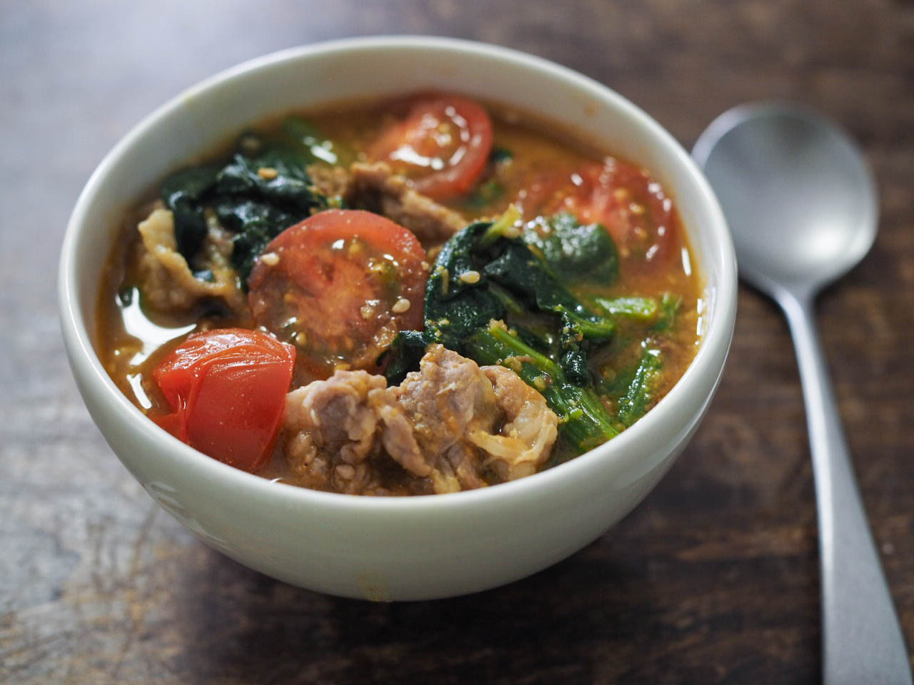 • フライパンを熱してごま油を入れ、ほうれん草を炒める。Bを入れて沸騰したら1の豚肉をばらばらにしながら入れ、軽く混ぜてふたをして煮る(3~5分)
