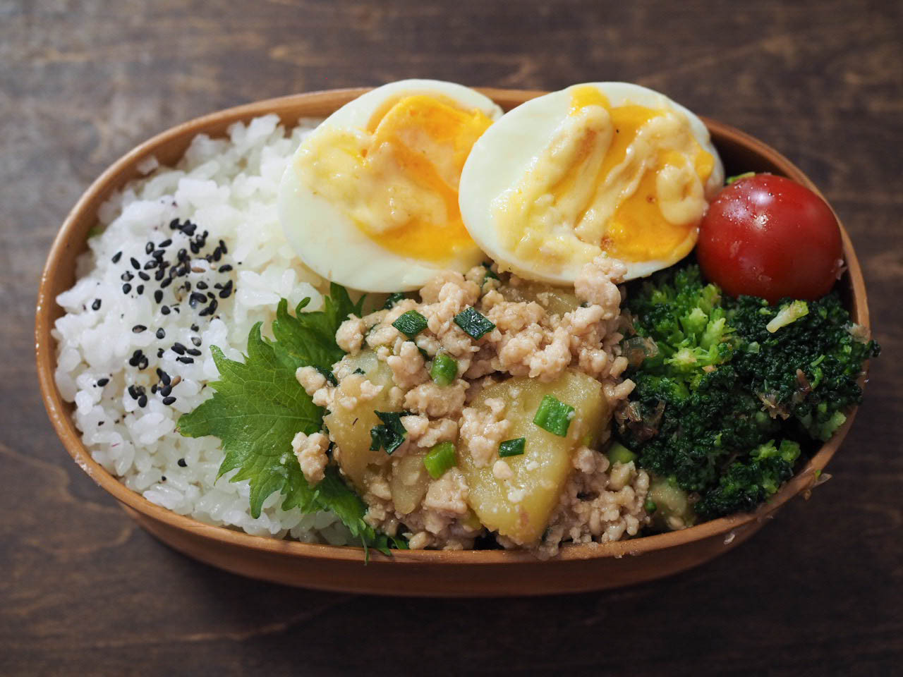 • お弁当箱にご飯を詰め、じゃが芋のそぼろ煮、ゆで卵のマヨネーズ焼き、ブロッコリーのおかか醤油漬け、ミニトマトを詰める。