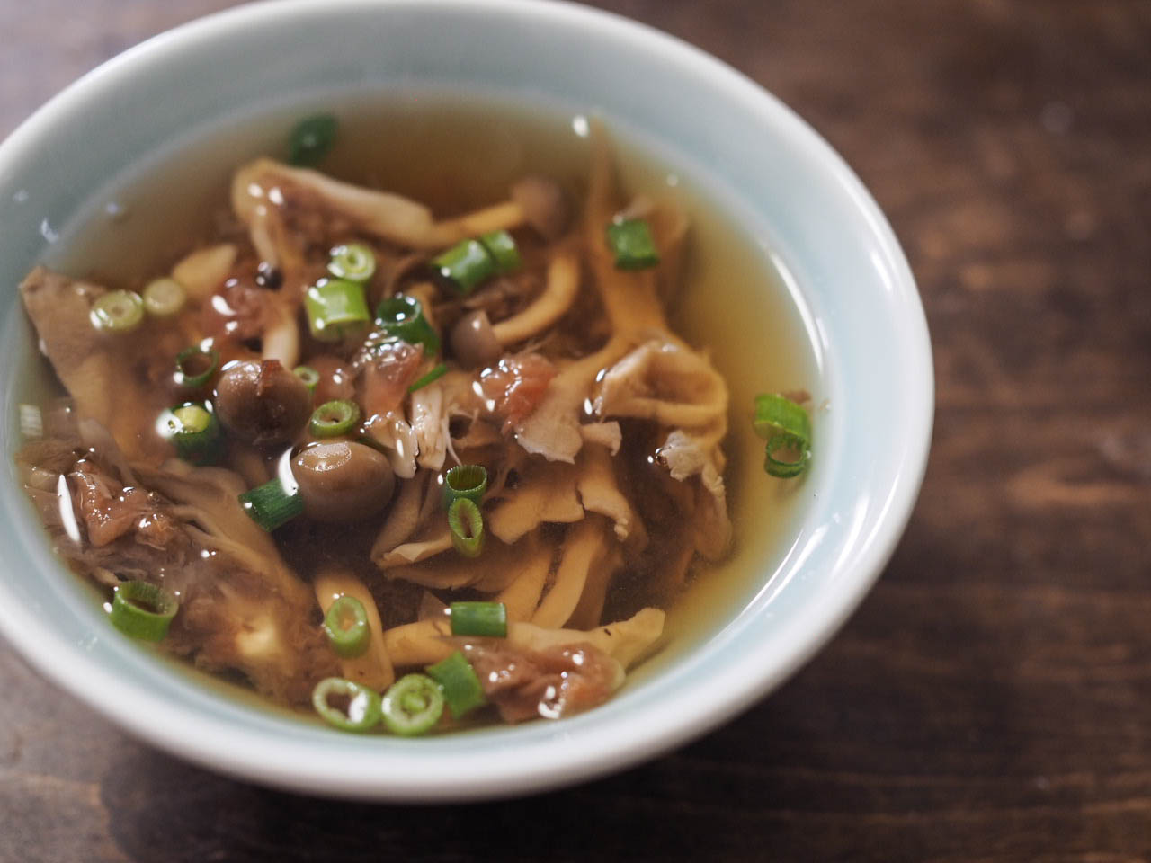 梅きのこを器に入れ、熱湯を注ぎ、醤油で味を調え、青ネギを入れる。