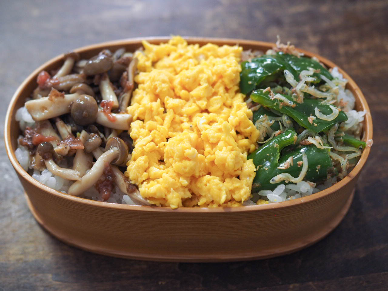 お弁当箱にご飯を入れ、梅きのこ、炒り卵、じゃこピーマンをのせる。