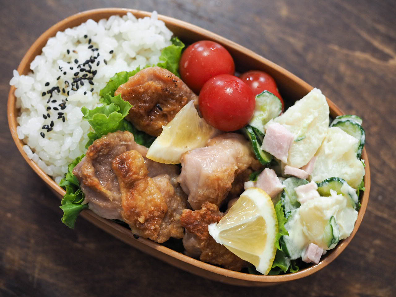 お弁当箱にご飯を詰め、チキンソテーとポテトサラダ、ミニトマトを詰める。