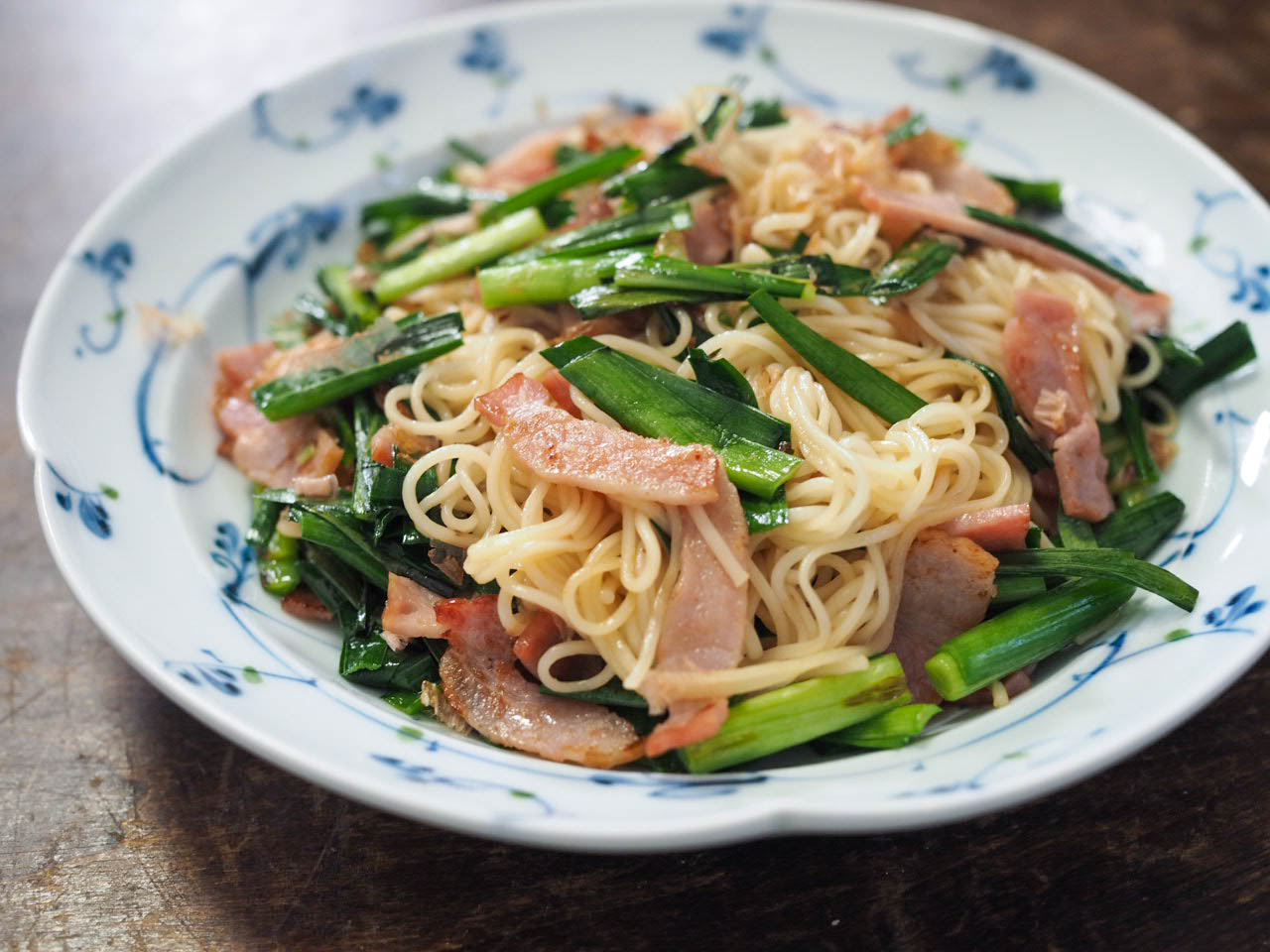 フライパンにごま油とベーコンを入れて炒め、ベーコンに良い焼き色がついたらニラを入れて炒め合わせる。