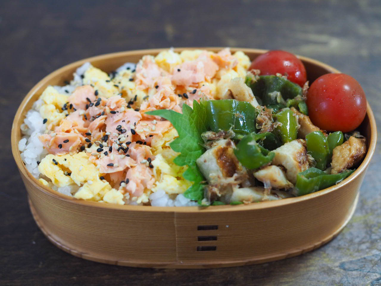 お弁当箱にご飯を詰め、炒り卵、奥薗鮭フレークをのせ、ごまを振り、ピーマンおかか炒めと、ミニトマトを詰める。