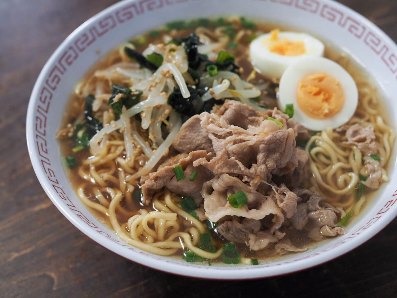 インスタントラーメンを作り、ニンニクゆで豚、万能蒸しもやし、ゆで卵をのせる。