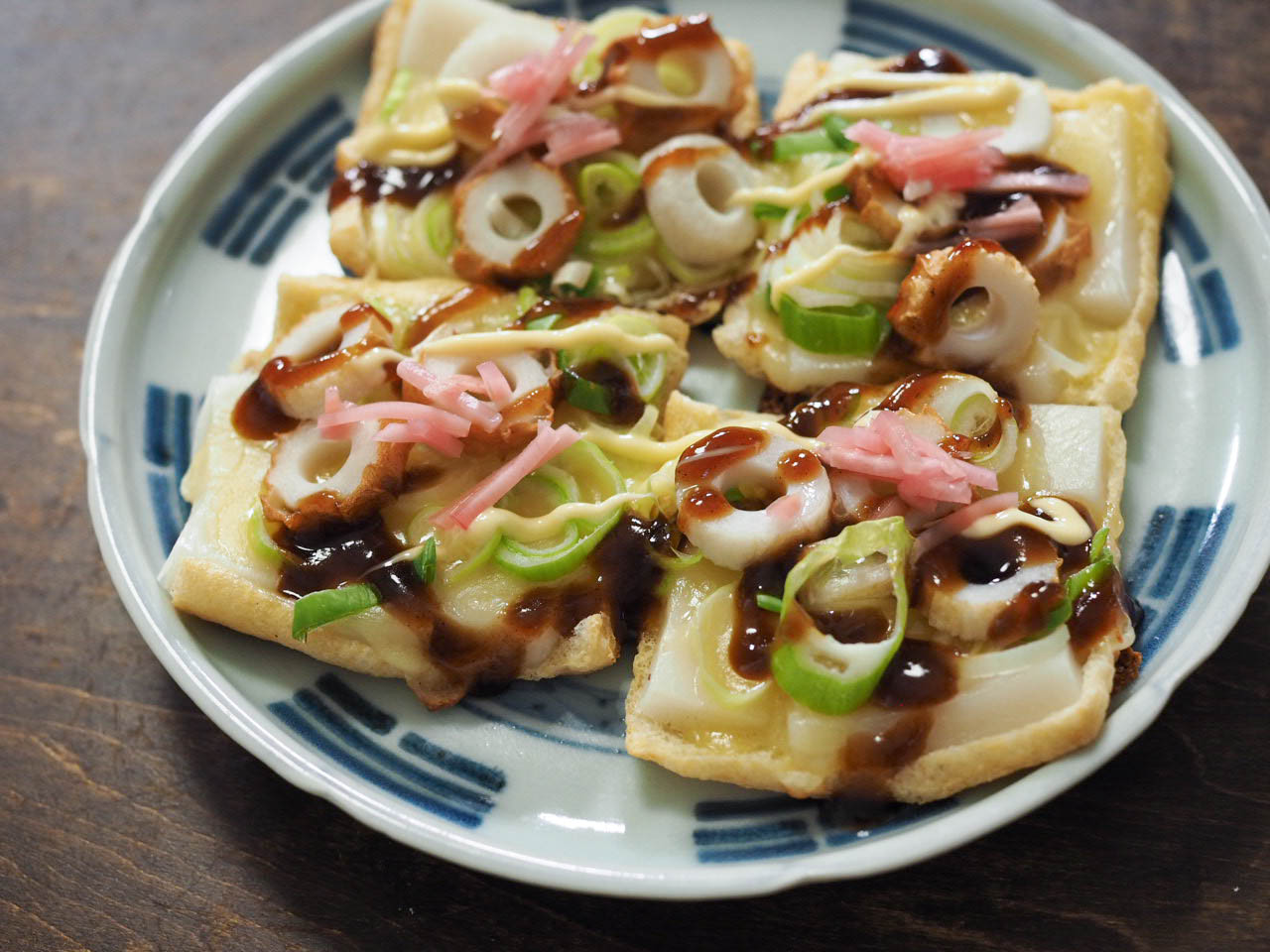 • フライパンを熱し、油揚げ、餅、チーズ、ネギ、ちくわの順に乗せたら蓋をして5分ほど蒸し焼きにする。