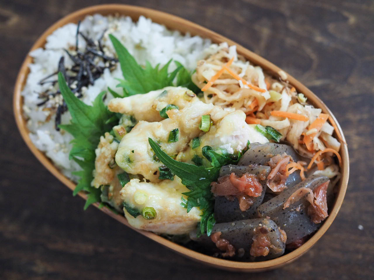 • お弁当箱にご飯を詰め、鶏むね肉のピカタ、切り干し大根の煮物、こんにゃくの梅煮を詰める。