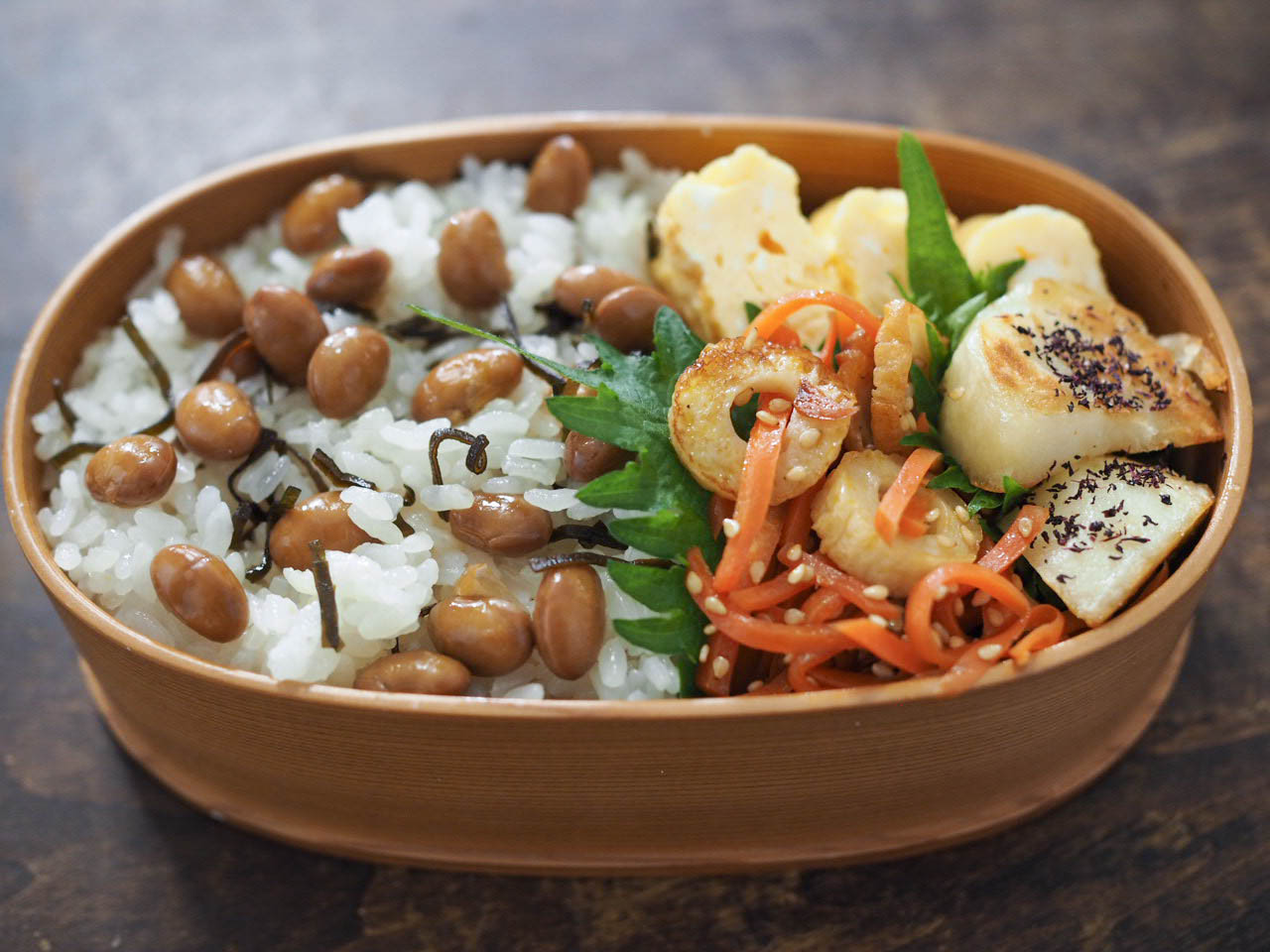 • 炒り豆混ぜご飯、卵焼き、人参のきんぴら、ベイクドポテトを詰める。