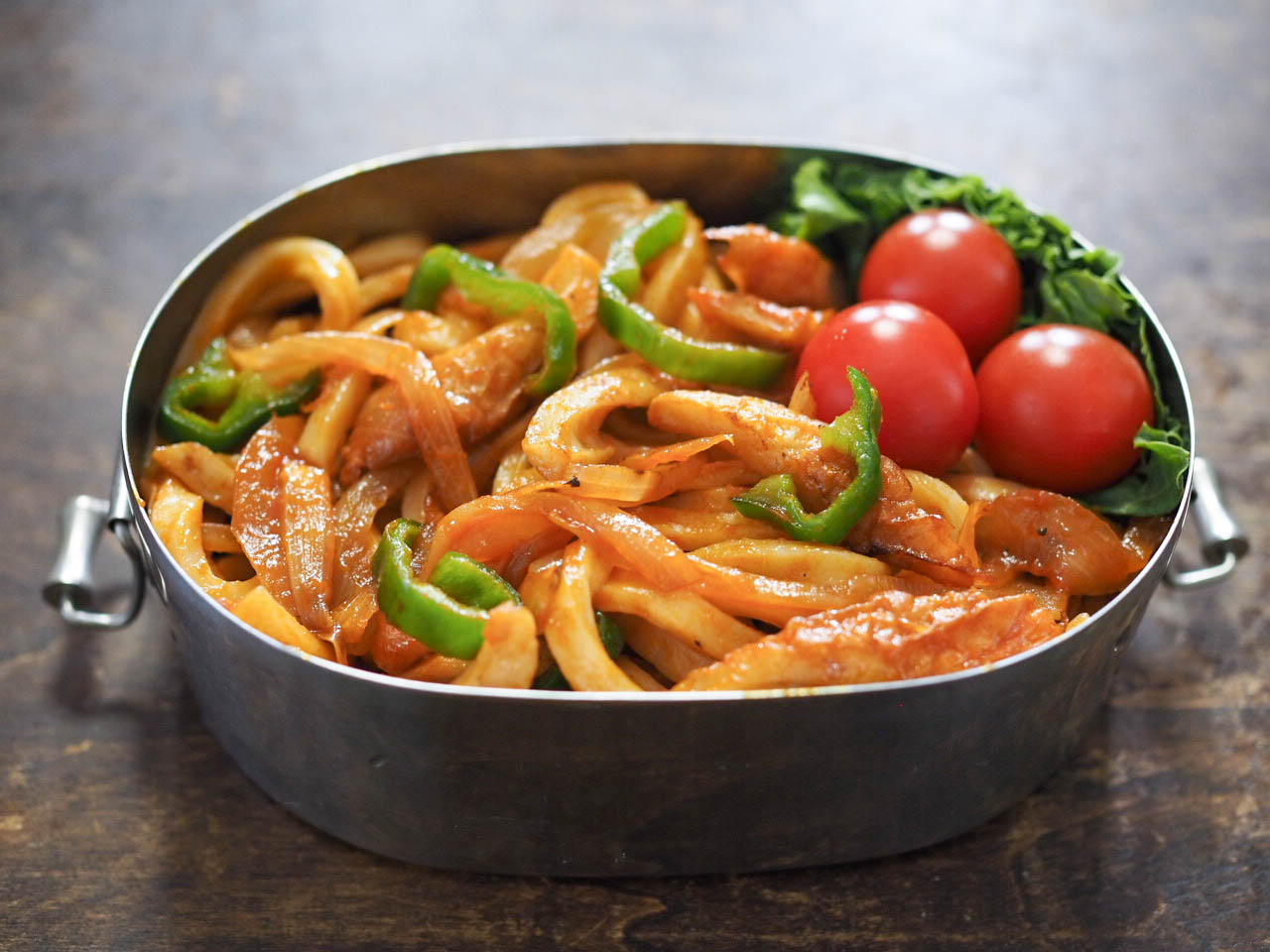 ケチャップの水分が飛んでねっとりしたら水を入れ、全体を混ぜたら、うどんを入れてふたをする。(2分)