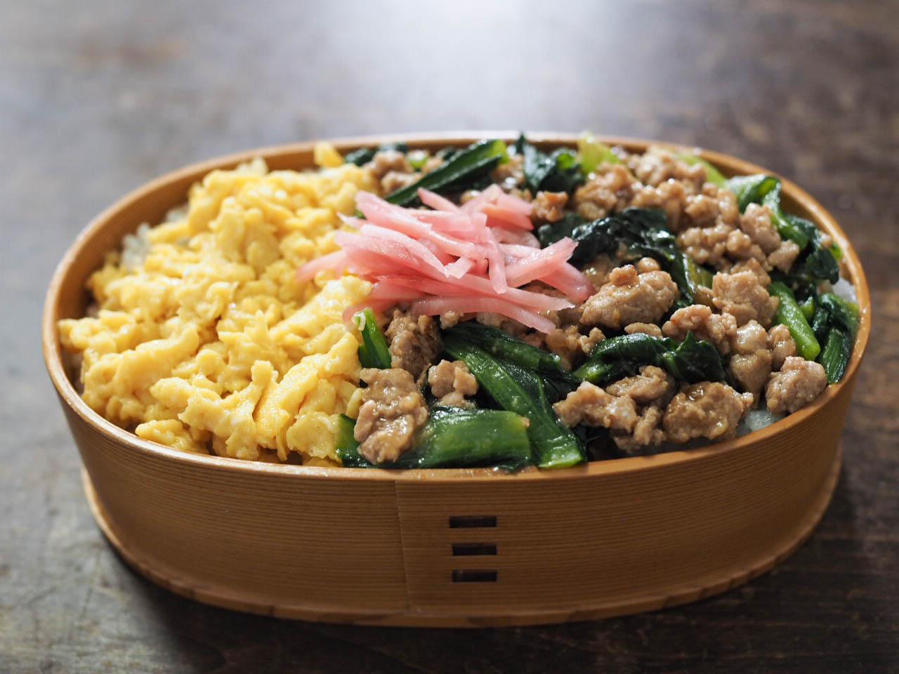 お弁当箱にご飯を入れ、炒り卵と、小松菜肉味噌炒めをのせ、紅ショウガを彩にのせる。