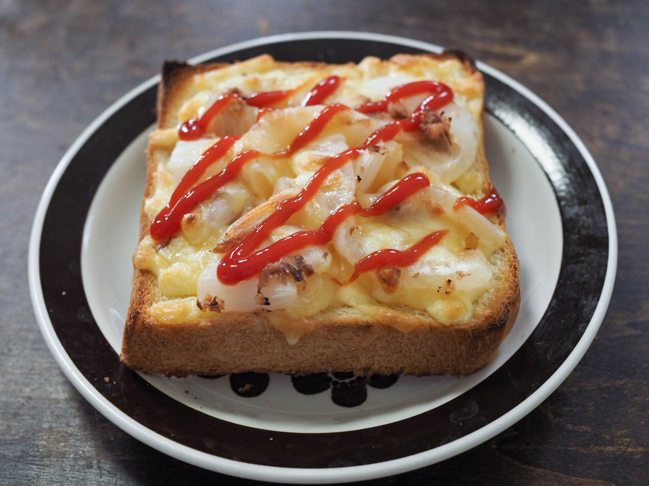 • 食パンにピザ用チーズ、万能蒸し玉ネギ、ピザ用チーズの順に乗せて焼き、お好みでケチャップをかける。