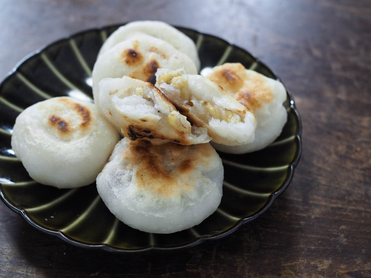 • フライパンを熱してこめ油を入れ、4のおやきを並べたら、水大さじ1~2を入れて吹いたをして蒸し焼きにする(3分)。