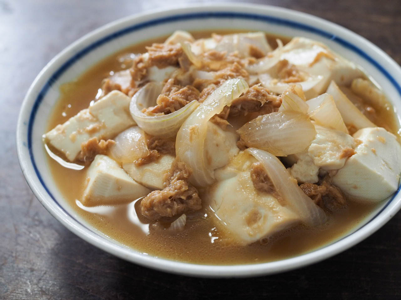 水分が飛んでそぼろ状になったらBの玉ねぎを入れて炒め合わせ、豆腐と水を入れてふたをして蒸し煮にする(8~10分)。