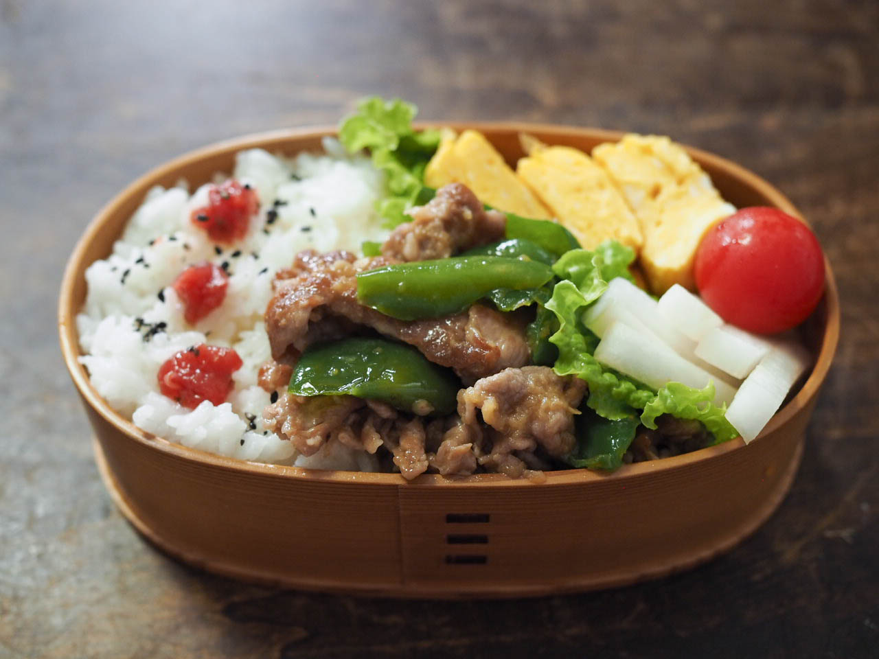 • お弁当箱にご飯を詰め、豚肉とピーマンの味噌煮、卵焼き、大根のレモン塩麹漬け、ミニトマトを詰める。