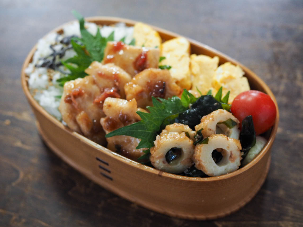 • お弁当箱に、ご飯を詰め、卵焼き、万能鶏むね肉の梅照り焼き、わかめとちくわの煮もの、ミニトマトを詰める。