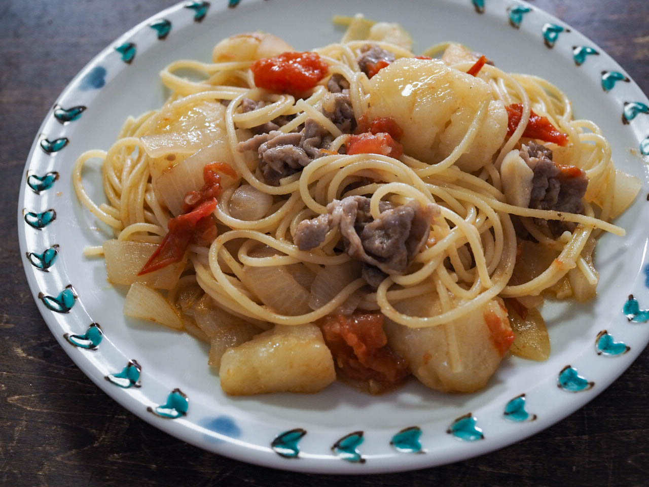 • ゆであがったスパゲテーの湯を切って、トマト肉じゃがに入れて混ぜる。