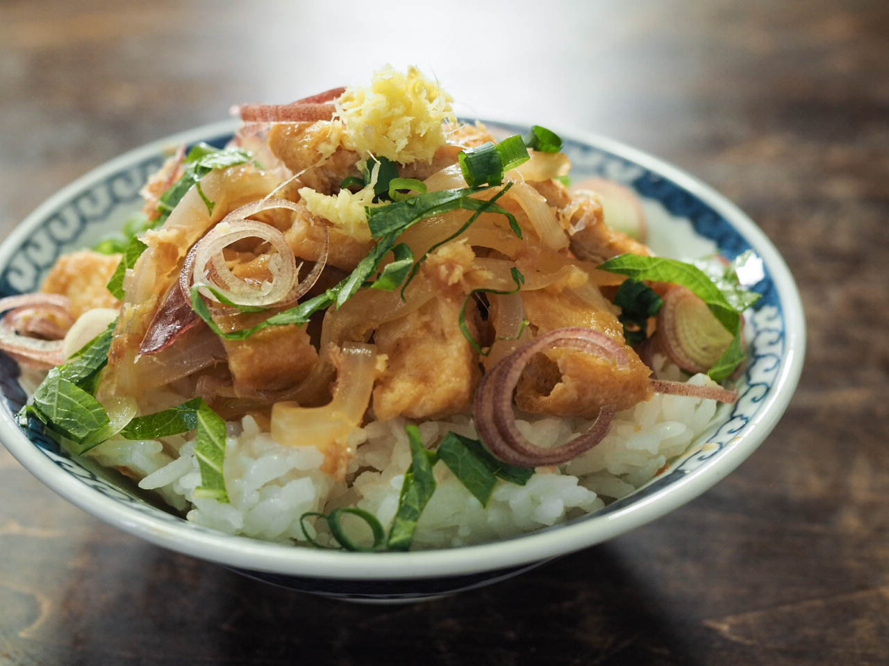 • どんぶりにご飯を入れて、その上に油揚げの生姜焼きをのせ、お好みの薬味をたっぷりとのせる。