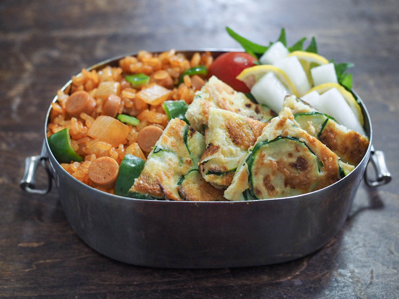 お弁当箱に、ケチャップライス、ズッキーニチヂミ、大根のレモン麹漬けを詰める。