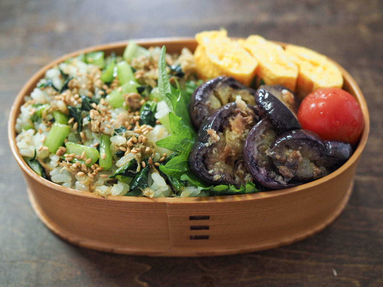 お弁当箱に、小松菜とツナの混ぜご飯、卵焼き、ナスの南蛮漬け、ミニトマトを詰める。