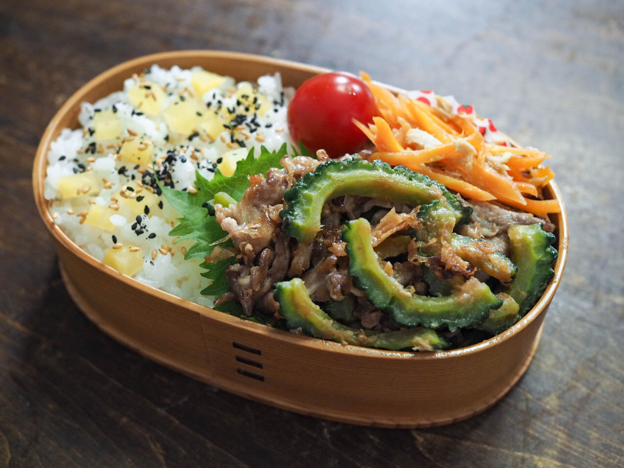 • お弁当箱にご飯を詰め、ゴーヤーと豚肉の味噌炒め、人参しりしり、ミニトマトを詰め、ご飯の上に、たくあんとゴマをのせる。
