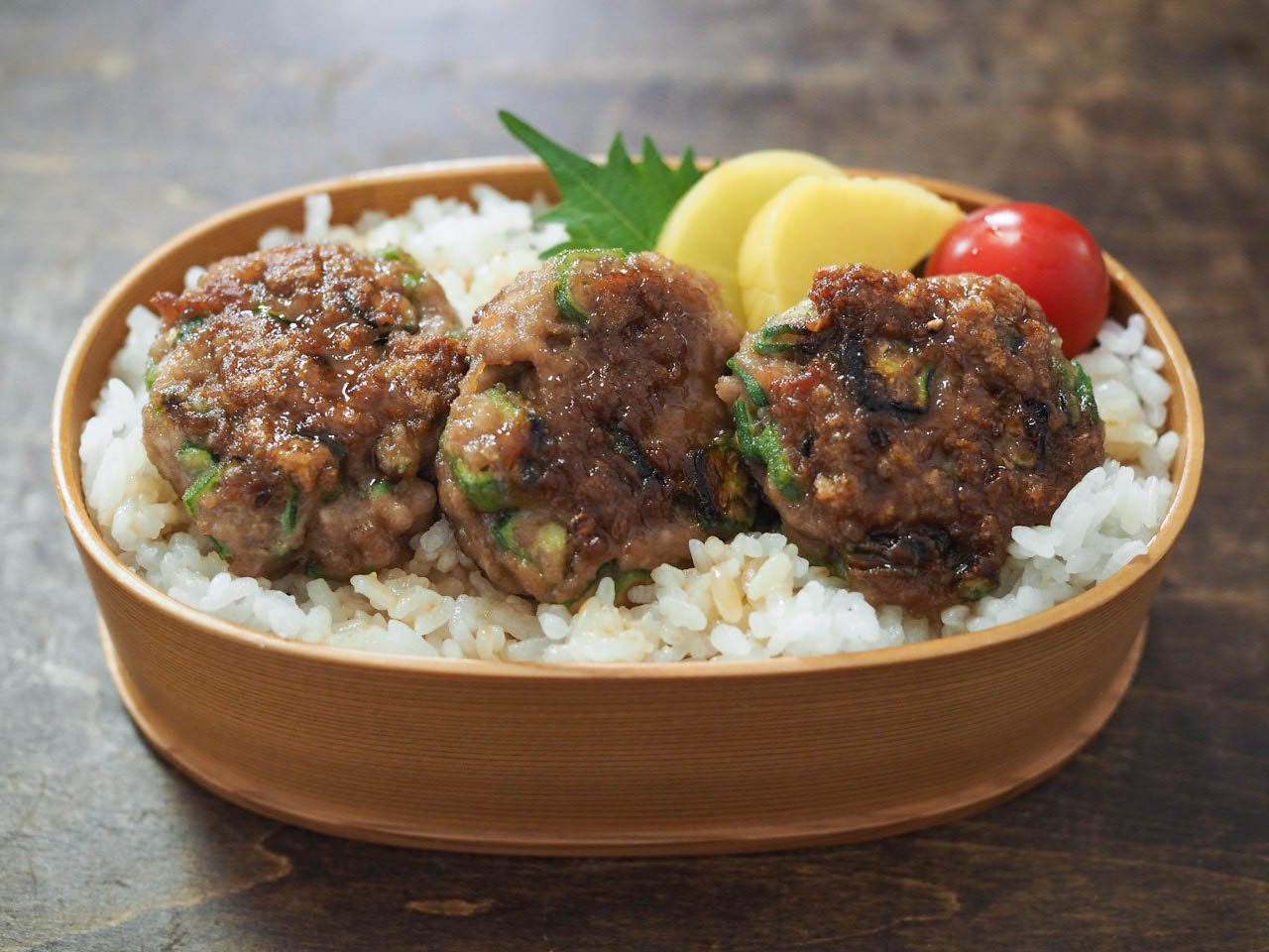 お弁当箱にご飯を詰め、オクラ肉団子をたれごとのせ、たくあん、ミニトマトを添える。
