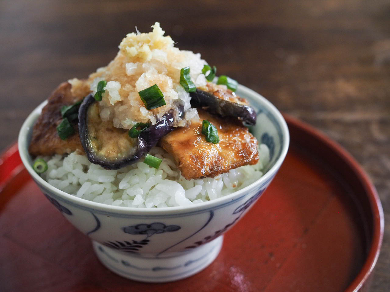 ご飯の上に、ナスと厚揚げの照り焼きをのせ、大根おろしをのせて、ポン酢しょうゆをかける。