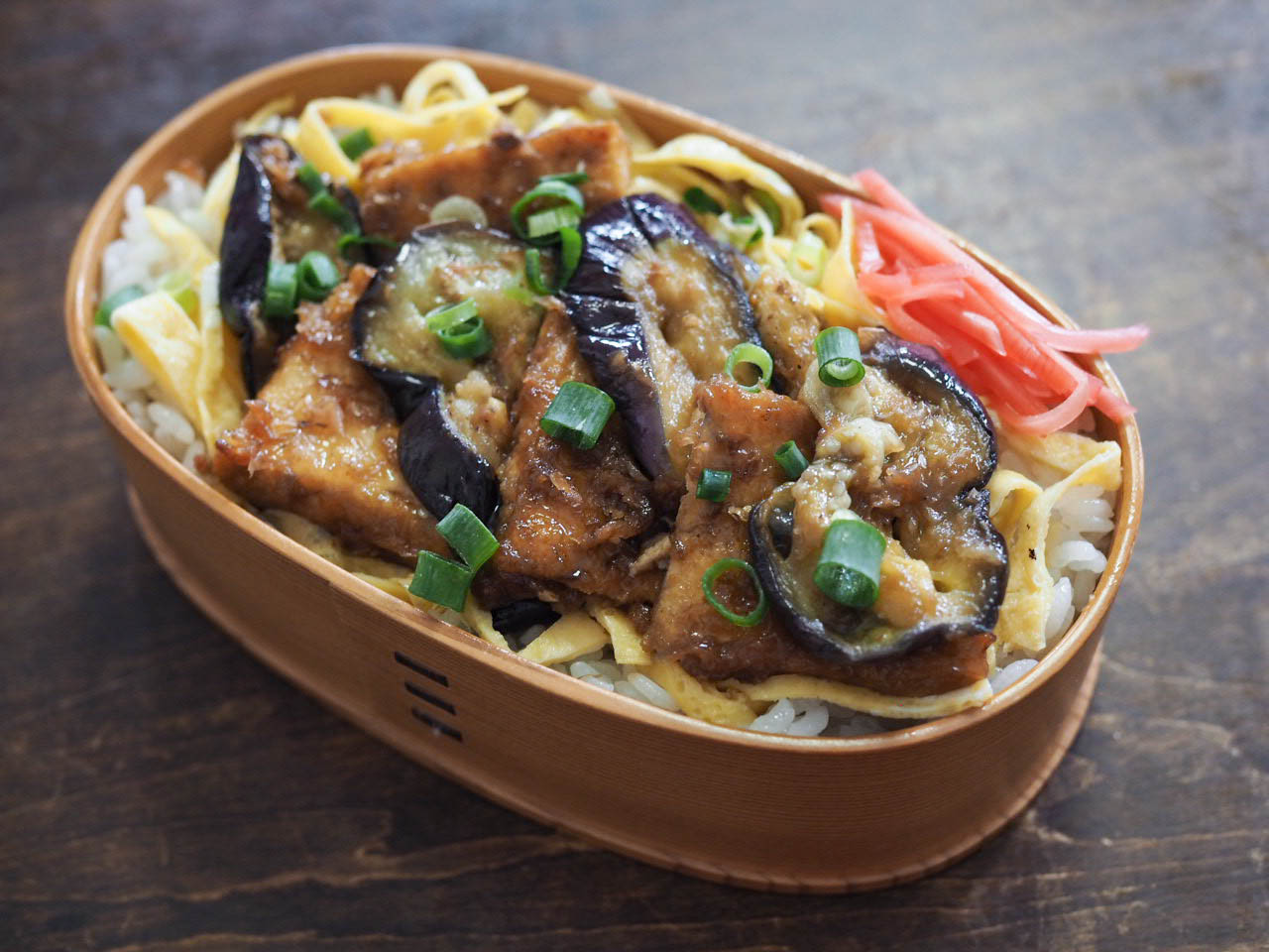 • お弁当箱にご飯を詰め、錦糸卵を広げてから、ナスと厚揚げの照り焼きをのせる。