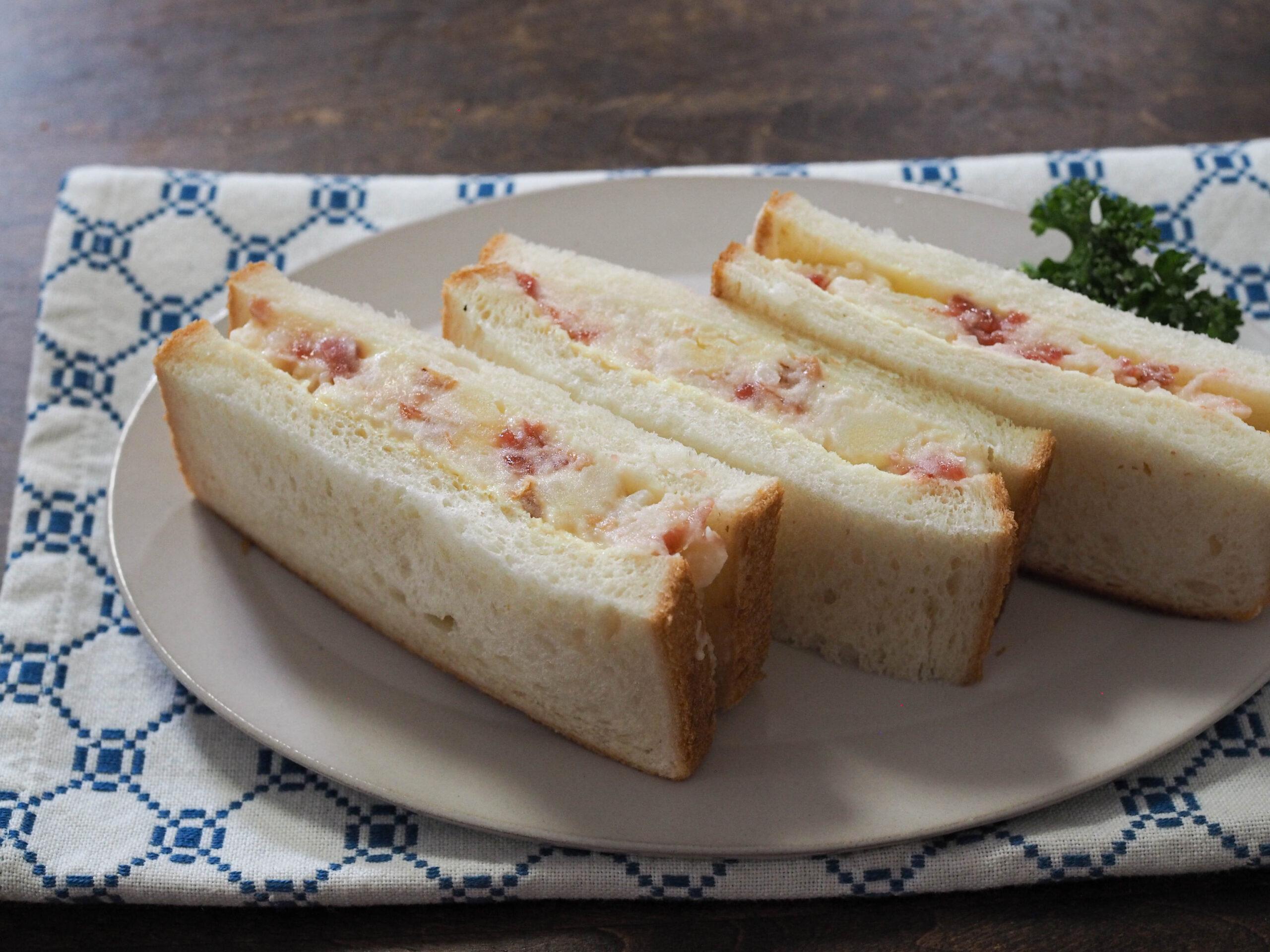 • 食パンにマヨネーズを塗り、梅ポテトサラダをサンドして、食べやすく切る。