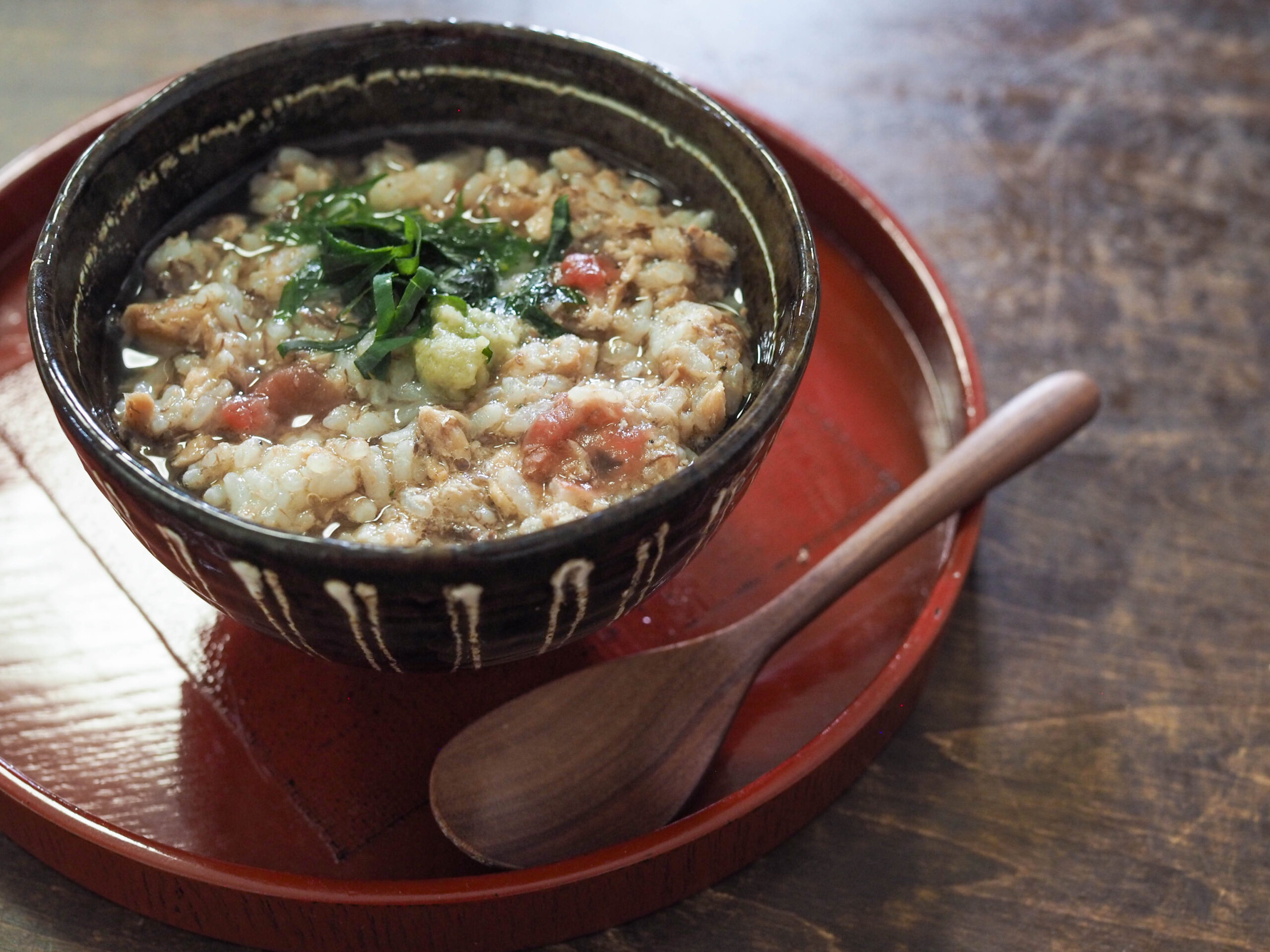 サバ缶梅しそご飯に熱湯を注ぐだけ