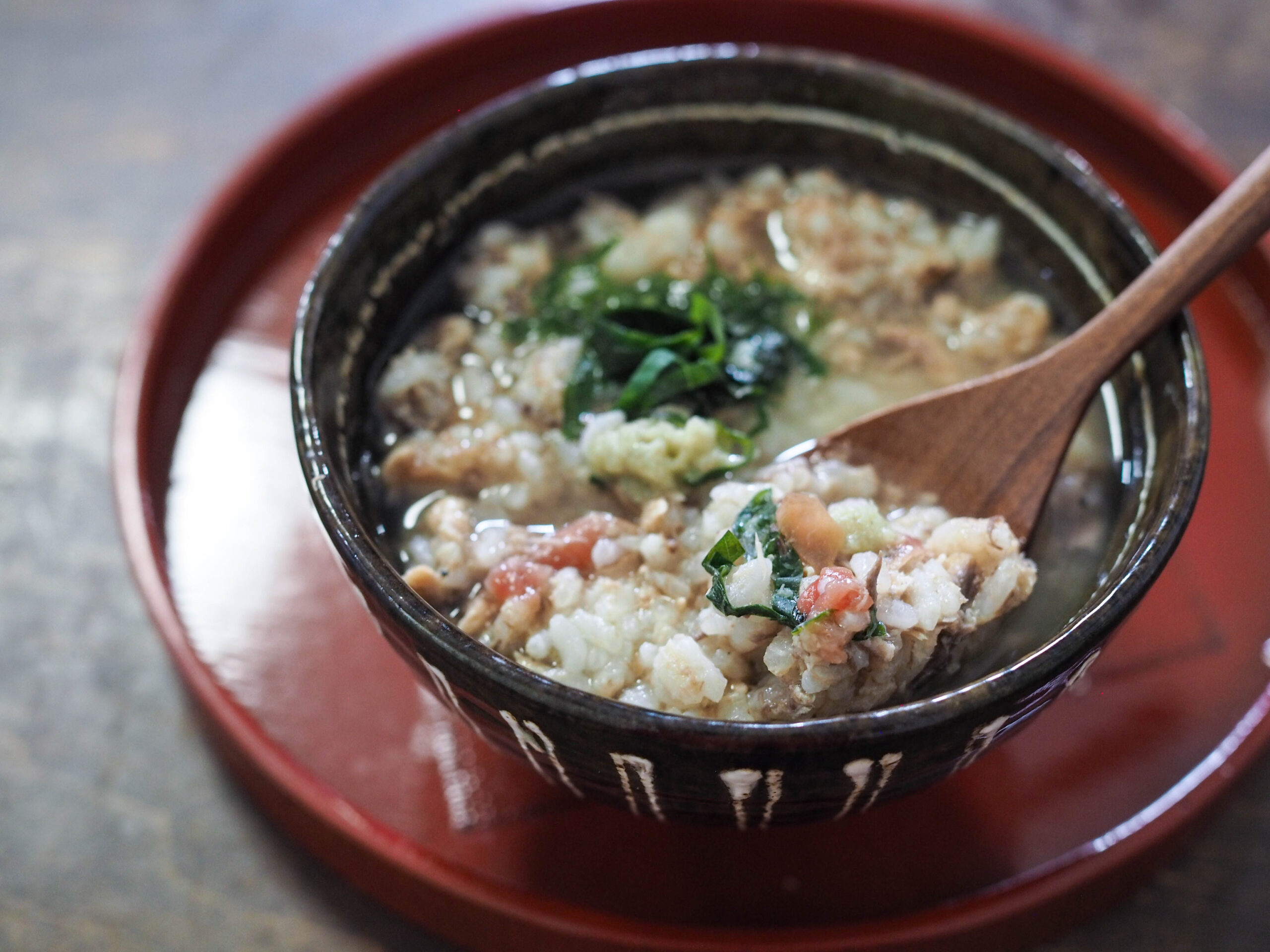 水分がほぼ飛んだら火を止め、ご飯と梅干を入れて混ぜる。