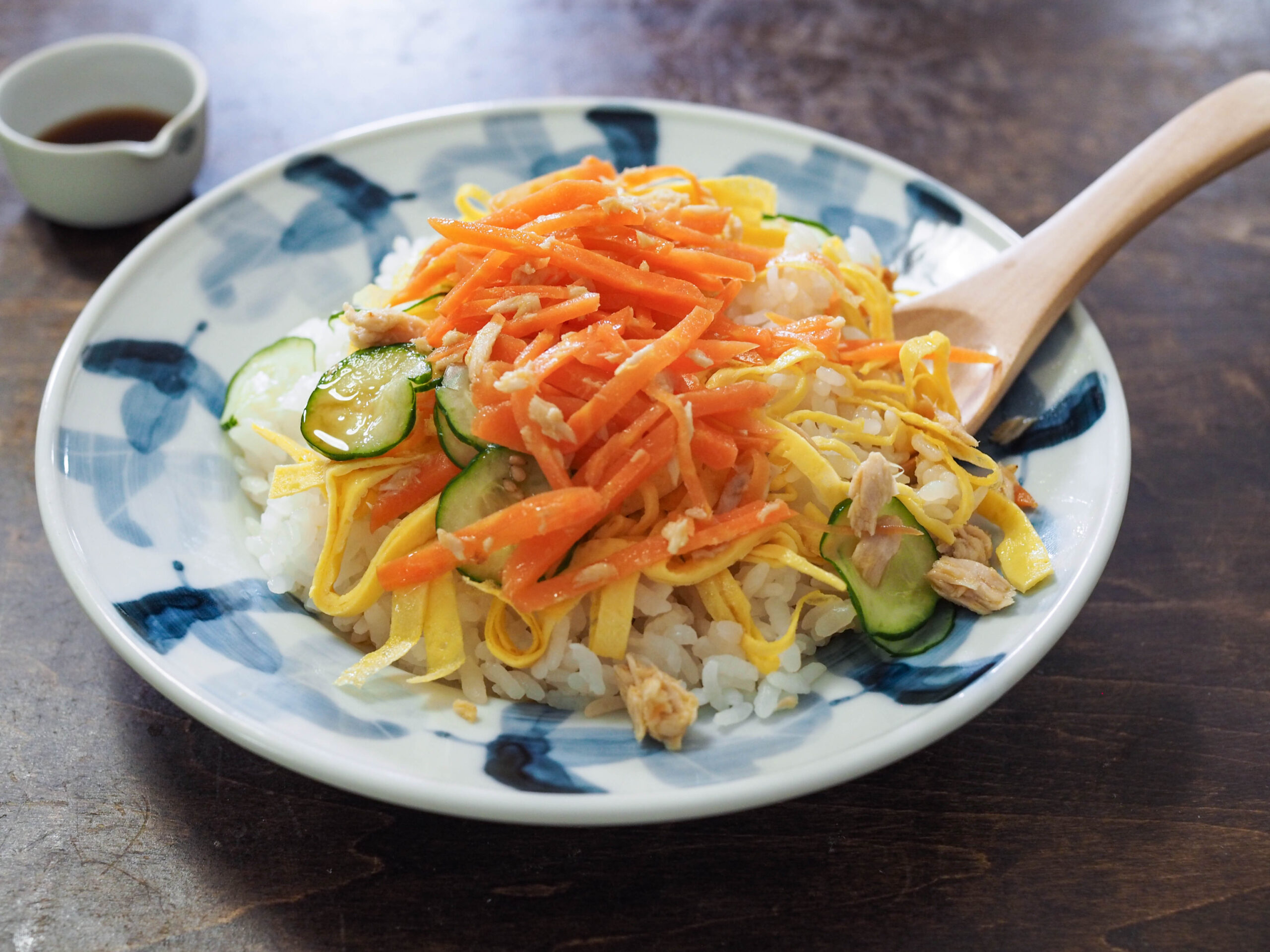 ご飯に、錦糸卵、人参サラダ、キュウリをのせ、ポン酢しょうゆをかける。