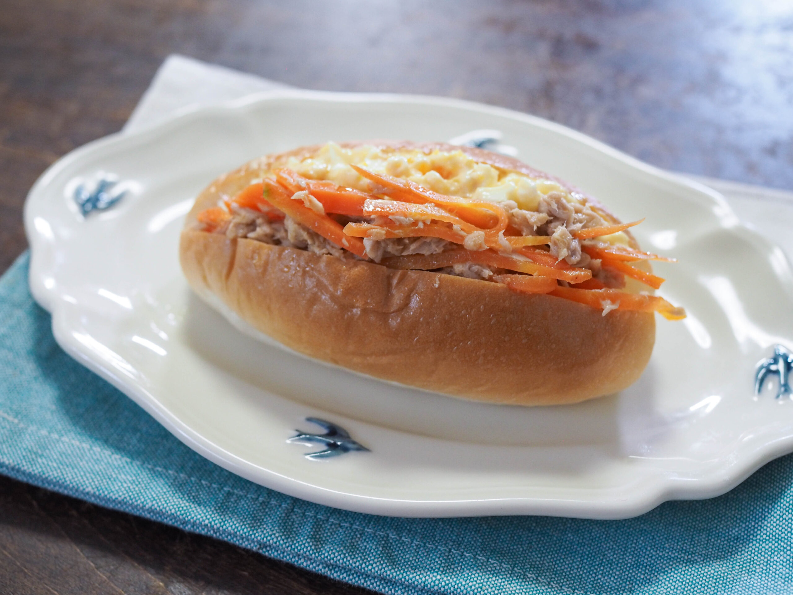 • ドックパンに切れ目を入れ、卵のマヨネーズ和えとニンジンサラダを挟む。