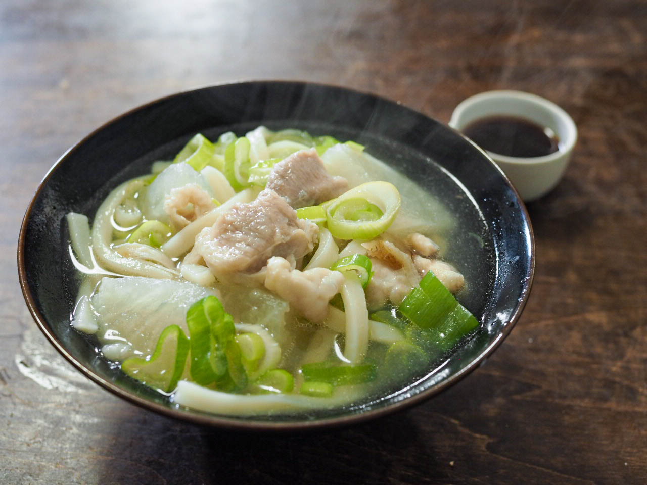 鶏と大根のスープにうどんを入れ、食べる時にポン酢しょうゆを入れる。